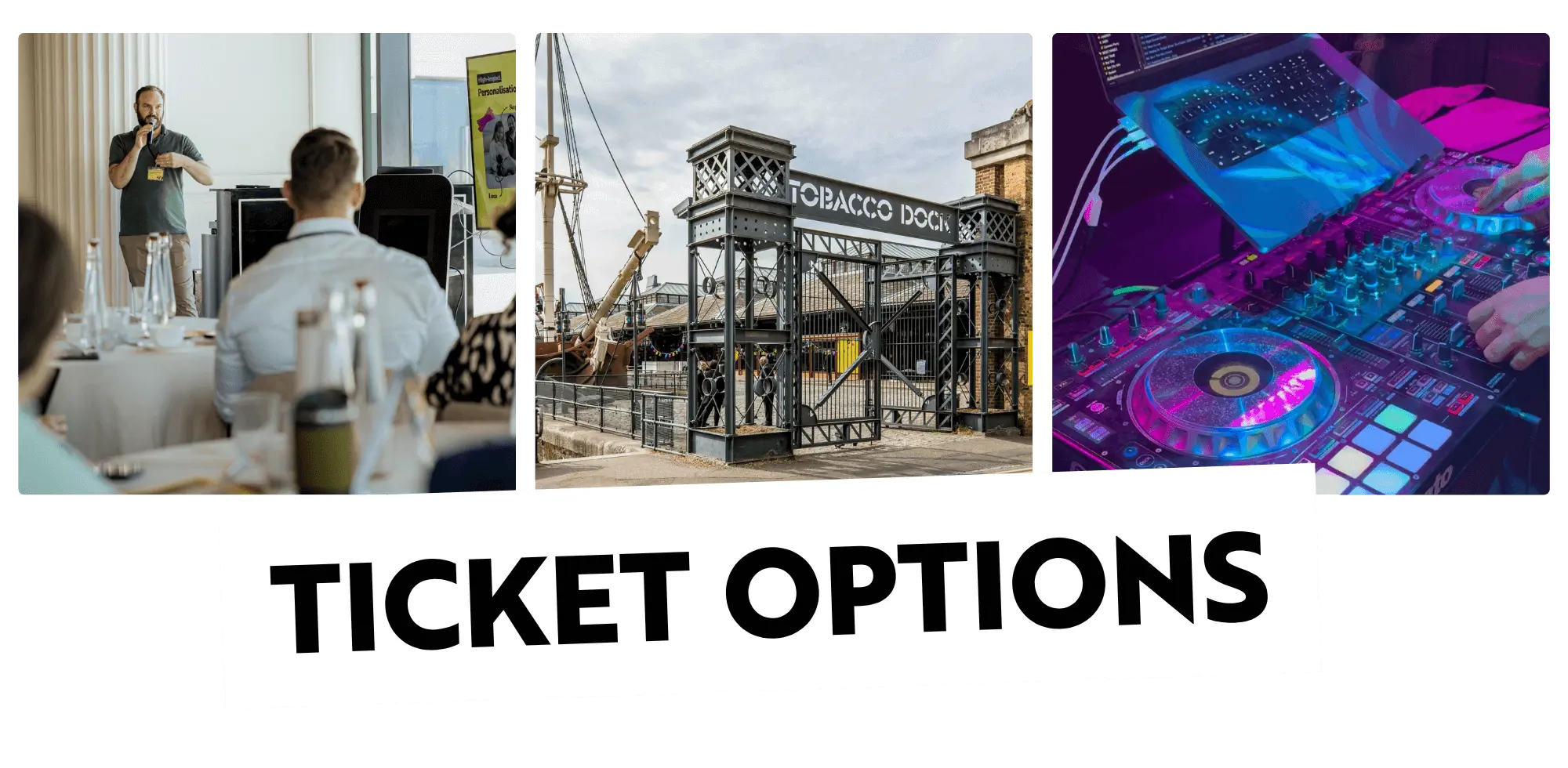 Tobacco Dock is located in East London and is easy to reach by public transport. 🚆 The nearest Tube stations are Wapping (Overground, Windrush Service) and Tower Hill (District and Circle Lines), both just a short walk away. 🚘 A 615-vehicle car park, operated by YellowPark, is located opposite the venue's Wapping Lane entrance. Bookings are available via their website here. ✈️ If you’re traveling internationally, London City Airport is around 25 minutes away by car, and Heathrow and Gatwick are both easily accessible by train or taxi. What3words: ripe.falls.bags |